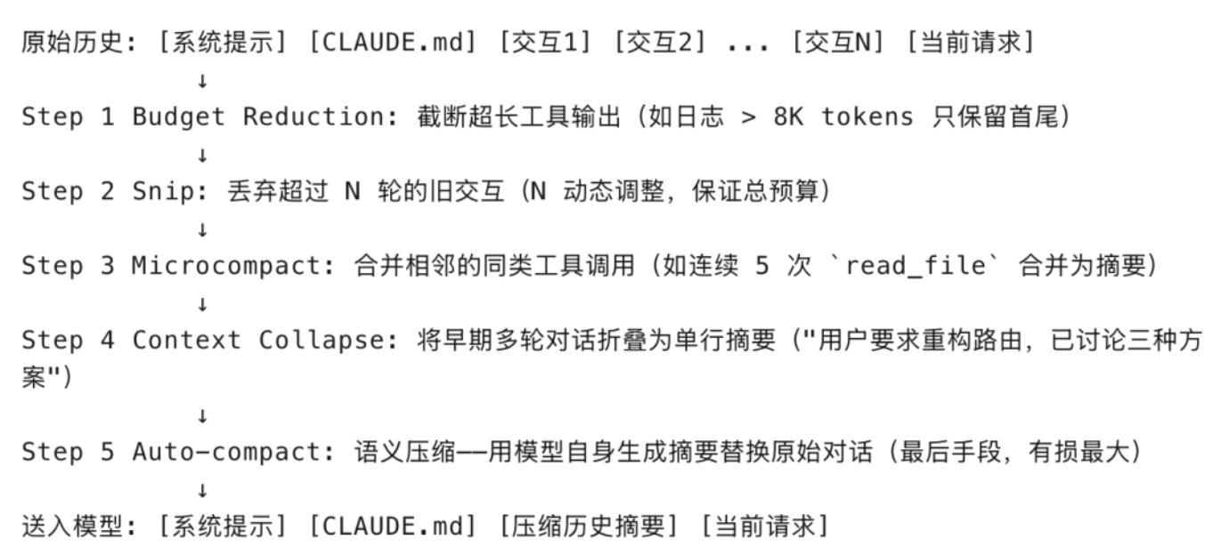 第一层BudgetReduction,截断超长输出,单个工具返回超过阈值(如日志、文件内容)时,直接截断保留首尾,中间用…(truncated)…替代。不触发模型推理,纯文本硬切割。